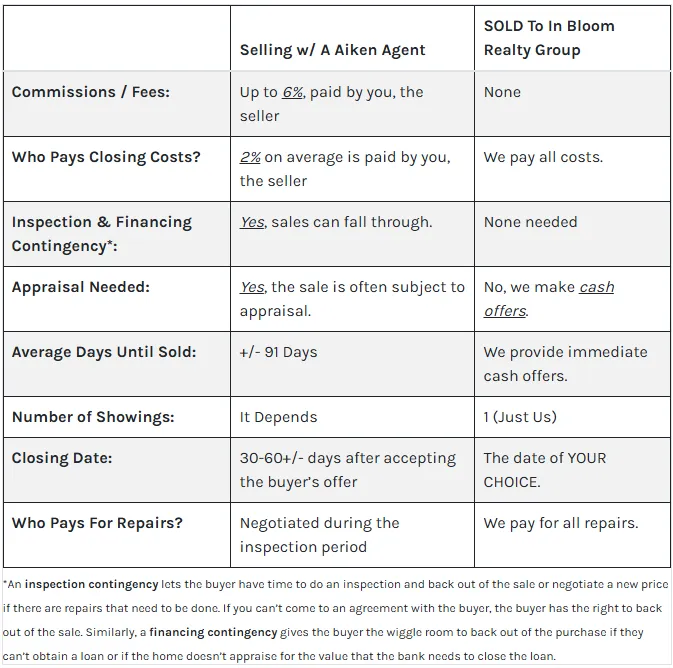 A: Great question. We’re not agents, and we don’t list houses. Here at In Bloom Realty Group, we are professional home buyers: We buy houses Aiken that meet our purchasing criteria, and we don’t use bank financing so you don’t have to worry about our ability to close on a deal. After purchasing, we may repair the house and resell it to another homeowner or keep it as a rental ourselves.