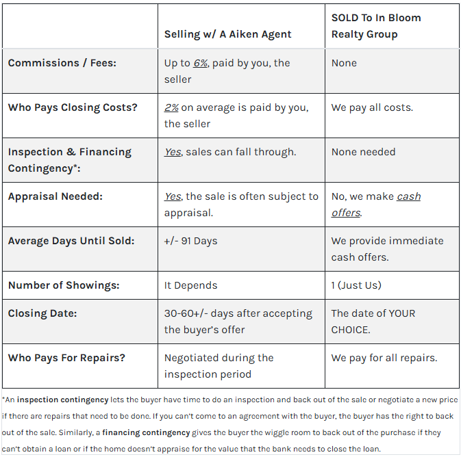 A: Great question. We’re not agents, and we don’t list houses. Here at In Bloom Realty Group, we are professional home buyers: We buy houses Aiken that meet our purchasing criteria, and we don’t use bank financing so you don’t have to worry about our ability to close on a deal. After purchasing, we may repair the house and resell it to another homeowner or keep it as a rental ourselves.
